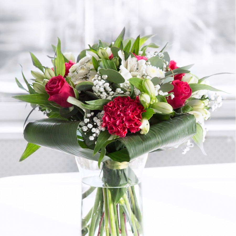Celebrate beauty with our radiant bouquet, featuring vibrant red roses alongside pristine white chrysanthemums. Complemented by gypsophila and lush aspidistra leaves, this arrangement is designed to bring joy and elegance to any space.