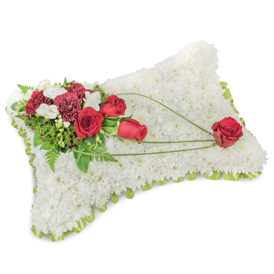 Share your sympathies with our elegant condolence flower arrangement, featuring a stunning mix of white chrysanthemums, red roses, white freesias, dark red carnations, dianthus, and bear grass.